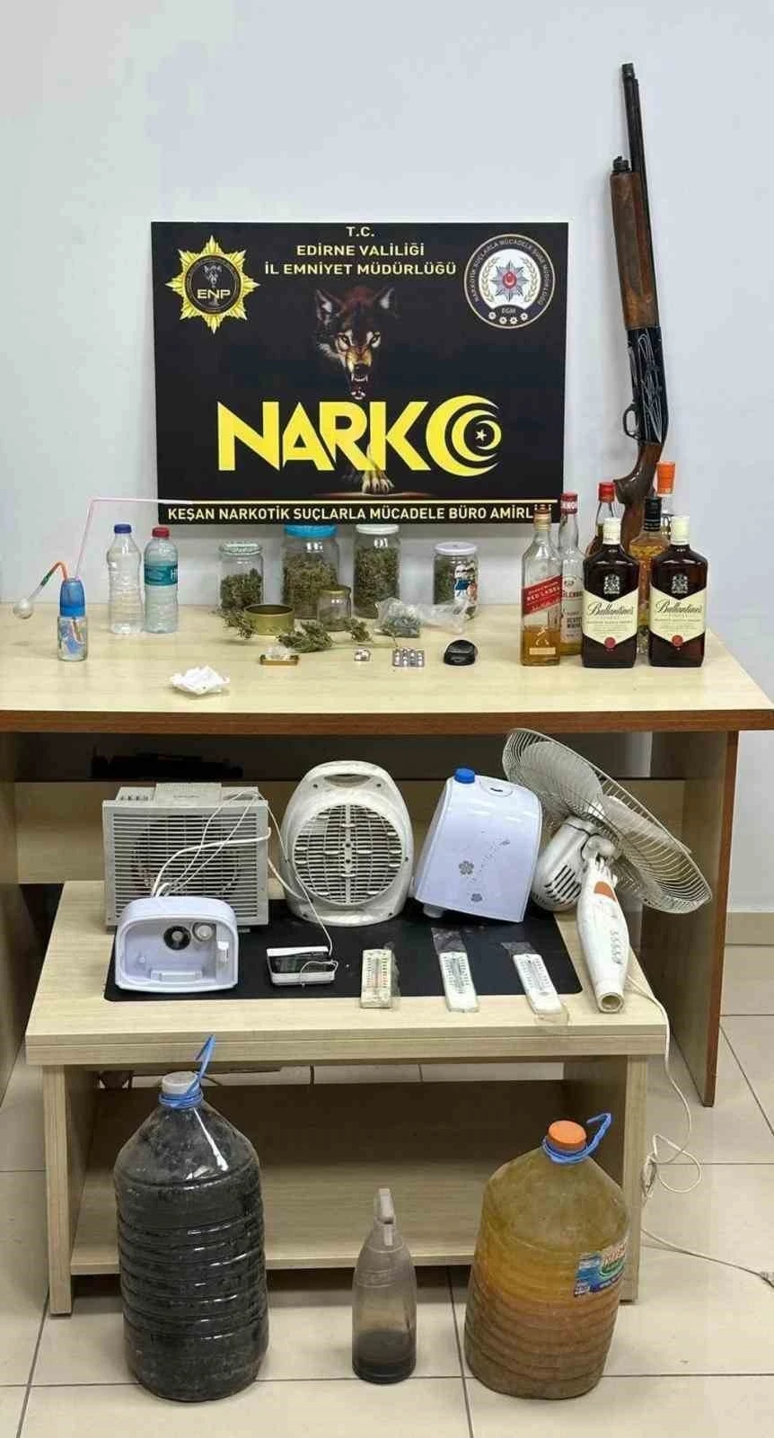 Keşan Narkotik Büro Amirliği ve İstihbarat Şube Müdürlüğü’nün koordineli çalışmalarıyla, Keşan Sanayi Sitesi’nde bulunan bir oto elektrikçiye ait iş yerine yapılan baskında iş yeri sahibi Y.Ç.’nin uyuşturucu madde bulundurduğu tespit edildi. Aramada yazıhanede 1 kilogram 972 gram esrar, 18 adet sentetik ecza hap, 6 adet ecstasy hap, 1.12 gram kenevir tohumu, 1 hassas terazi, 1 av tüfeği ve çeşitli kaçak içkiler ele geçirildi.