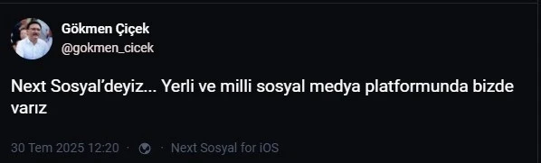 Vali Çiçek konu ile ilgili yaptığı paylaşımda, "Next Sosyal’deyiz. Yerli ve milli sosyal medya platformunda bizde varız" ifadelerine yer verdi.