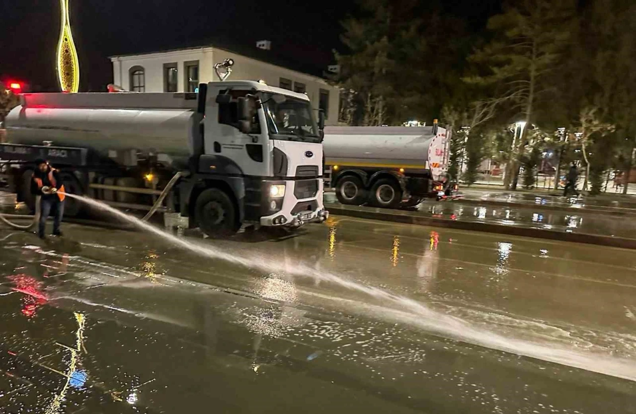 Ardından ekipler basınçlı su ile caddelerde detaylı yıkama işlemi yapıyor.