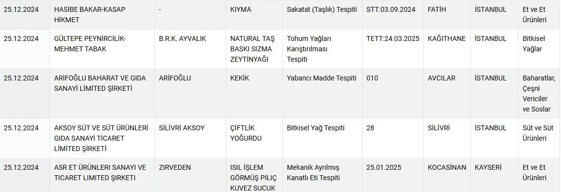 Daha ucuza üretebilmek için vatandaşa sattıkları sucuğun ve kıymanın içerisine sakatat, parça kırmızı etin içerisine ise tek tırnaklı hayvan eti karıştırdılar. Tarım ve Orman Bakanlığı, taklit ve tağşiş listesini güncelledi. Listeye sofralardan eksik olmayan 14 yeni ürün eklendi. Listede baharattan yoğurda, zeytinyağından sucuğa birçok ürün yer aldı. Son ifşa listesinde İstanbul’da yer alan "Hasibe Bakar Kasap" isimli firmada satılan kıymada ve Kırklareli’nde "Kızılcıkdere Görgüneroğlu" isimli firmanın sucuğunda sakatat, "Arifoğlu" firmasının sattığı kekikte yabancı madde, "Silivri Aksoy" firmasının sattığı yoğurtta bitkisel yağ tespit edildi.
