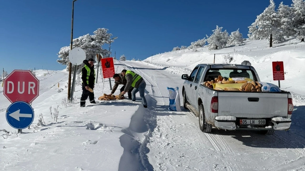 Merzifon Belediyesi ekipleri, araçlarla taşıdıkları ekmek ve yemleri ormanlık alana ulaştırdı.