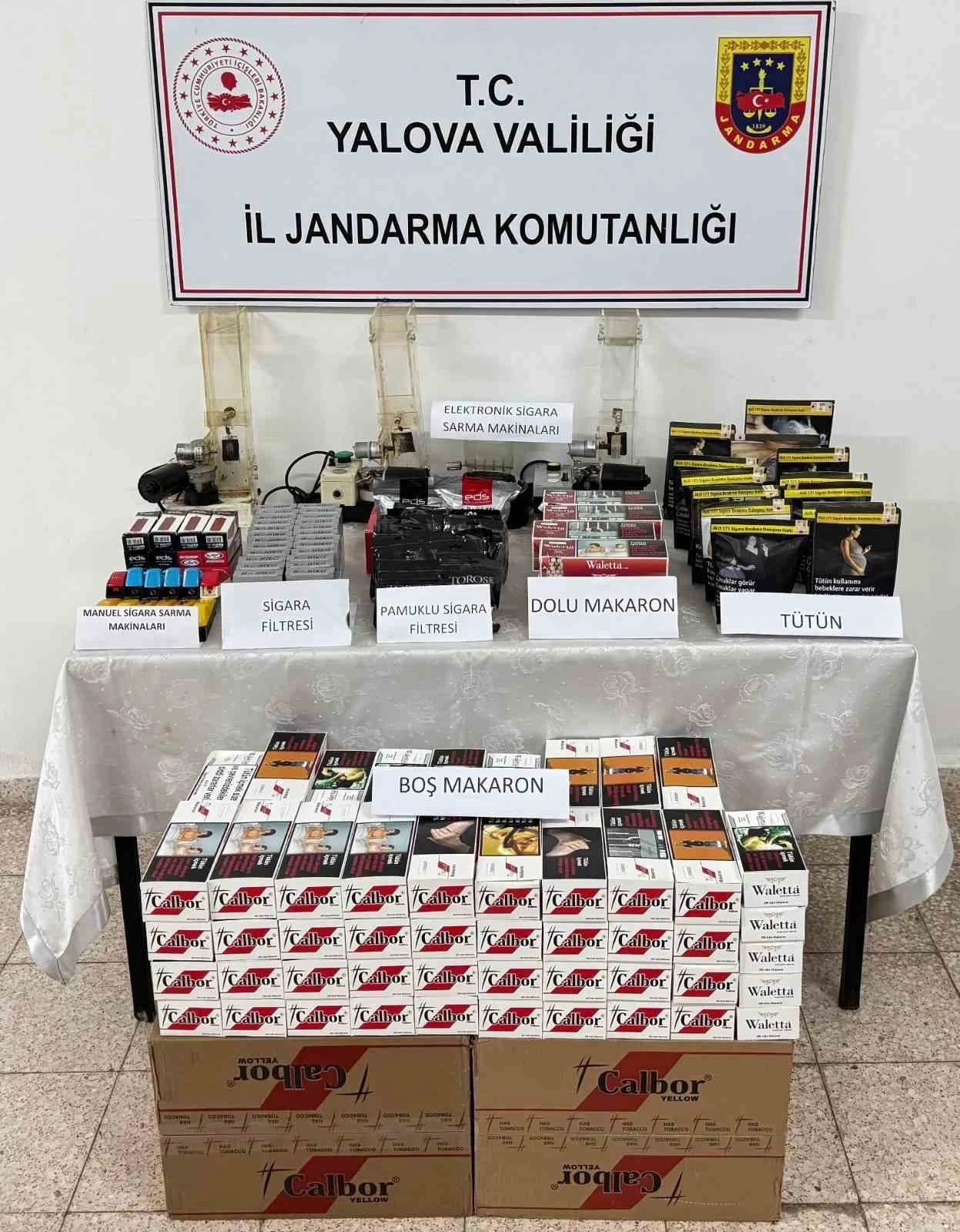Alınan bilgiye göre, Yalova İl Jandarma Komutanlığı ekipleri, yasal olmayan yollardan temin edilen tütün ve sigara yapımında kullanılan malzemenin Çınarcık ilçesinde satışı yapıldığı bilgisine ulaştı. Elde edilen bilginin değerlendirilmesi üzerine, Çınarcık İlçe Jandarma Komutanlığı ve Kaçakçılık ve Organize Suçlarla Mücadele Şube Müdürlüğü ekipleri ilçede iki ayrı adreste eş zamanlı yaptığı aramada 441 adet tütün dolu makaron, 17 bin 200 adet boş makaron, 6 bin 78 adet sigara sarma kağıdı, 3 bin 135 adet ağızlık, 12 bin 970 adet pamuklu sigara filtresi, 4 adet elektronik sigara sarma makinesi, 28 adet manuel sigara sarma aparatı ele geçirildi.