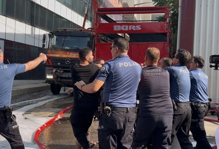 Bursa’nın Yıldırım ilçesinde bir tekstil atölyesinde yangın çıktı. Yangını söndürmek için ekipler seferber olurken, bir itfaiye personeli firma sahipleri tarafından darbedildi. Polisin biber gazıyla müdahale ettiği kavga kameraya yansırken, yangın kontrol altına alındı.