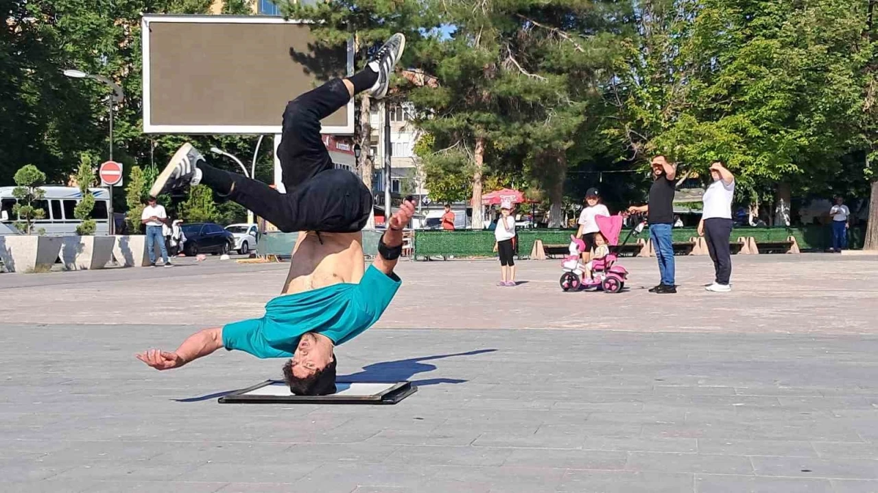 Katıldığı bir yarışmada break dansın bir türü olan ‘headspin’ kafa üstünde dönme hareketi ile ilgi gören ve ilk turu geçen Özkan Yağmur, Karaman’da ‘headspin’ performansıyla dikkat çekti.
