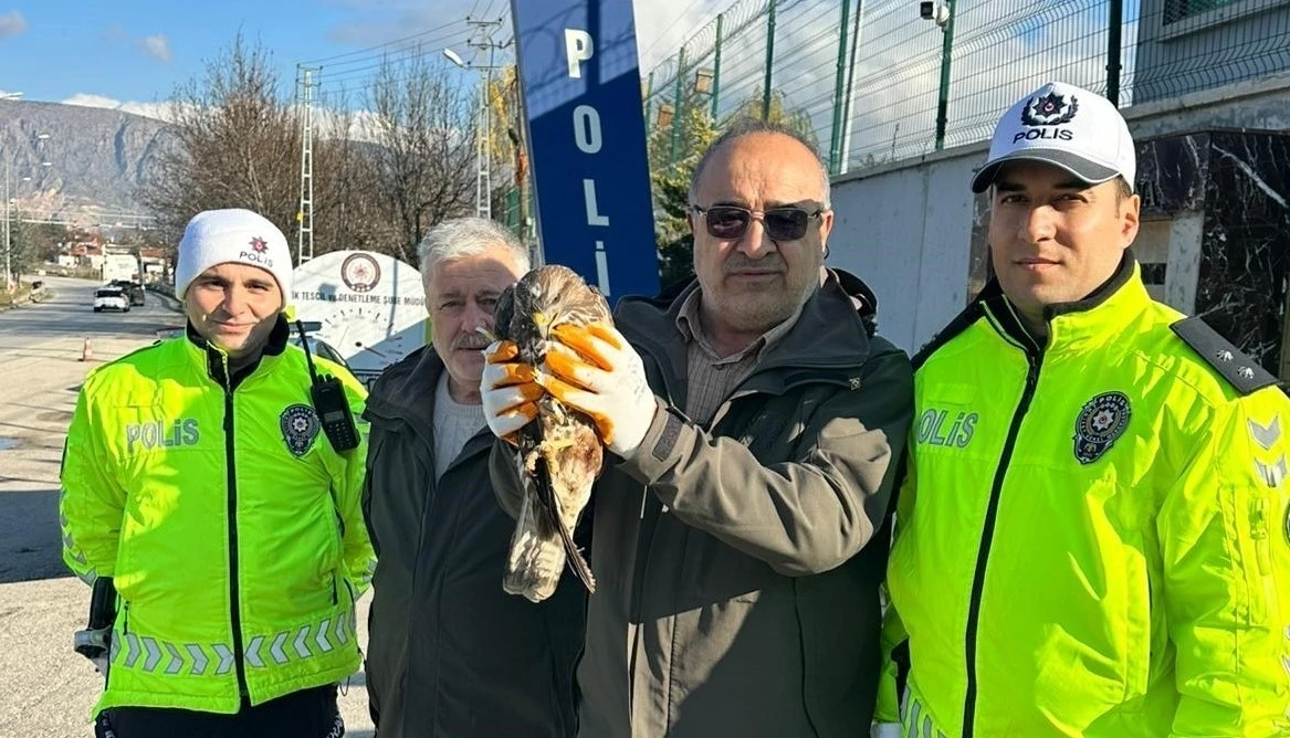 Amasya’da trafik denetimi yapan polis ekipleri yol kenarında yaralı bir kızıl şahin buldu. Kuş, Doğa Koruma ve Milli Parklar Şubesi görevlilerine teslim edildi.