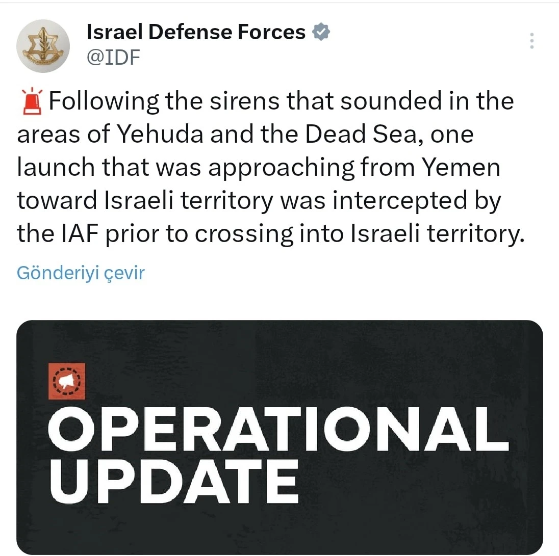 İsrail ordusu, Yemen’den fırlatılan bir füze nedeniyle Yehuda şehri ile Ölü Deniz kıyısındaki bölgelerde sirenlerin çaldığını açıkladı. Füzenin İsrail topraklarına girmeden önce etkisiz hale getirildiği bildirildi.