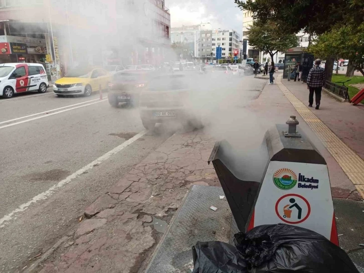 Samsun’da bir yer altı çöp konteynerinde bilinmeyen bir nedenle yangın çıktı. Çıkan yangında dumanla birlikte etrafa yayınlan kötü koku vatandaşı rahatsız etti.
