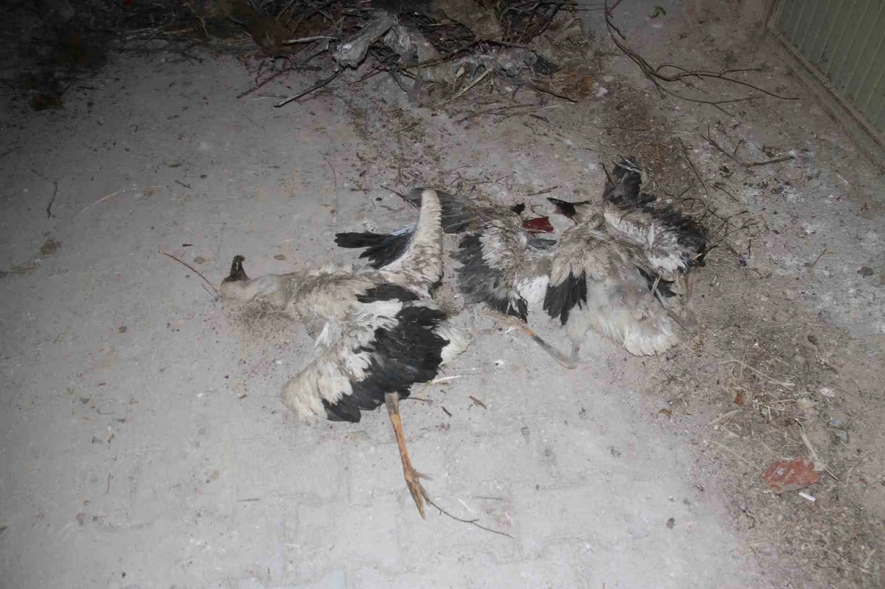 Konya’nın Beyşehir ilçesinde elektrik direğinden yuva ile birlikte düşerek yola savrulan yavru leylekler telef oldu.