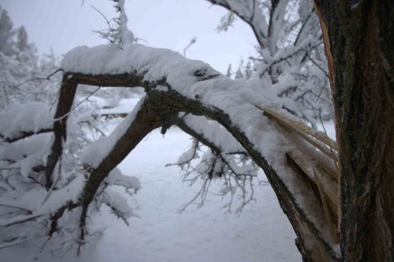 Elazığ’da etkisini artıran yoğun kar yağışı sonrası Harput Mahallesi’nde karın ağırlığına dayanamayan çok sayıda ağacın dalları ve gövdeleri kırıldı.