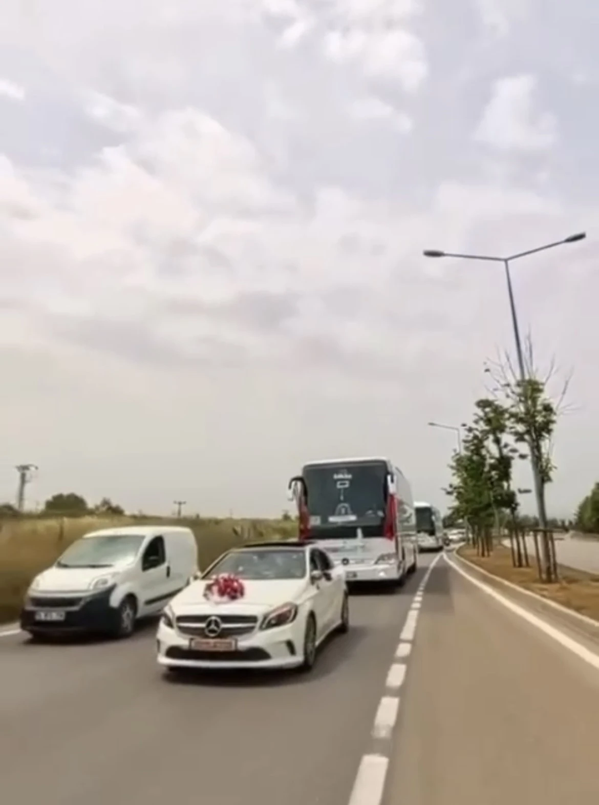 Bursa’da düğün aracı olarak yolcu otobüsünü tercih eden damat ve gelinin yakınları trafikte dikkat çekerken, konvoyda yer alan diğer otomobil sürücüleri ise trafikte tehlikeli hareketler yaparak hem kendilerini hem de diğer sürücüleri riske attı.