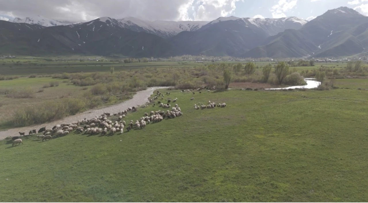 Hakkari’nin Yüksekova ilçesinde karların erimesinin ardından yeşile bürünen ovalar ve otlayan hayvanlar dron ile görüntüledi.