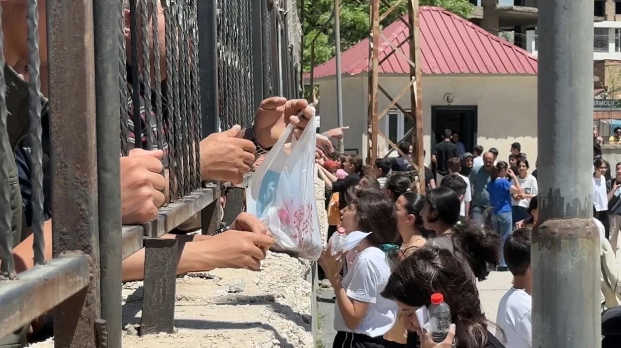 Hakkari’nin Yüksekova ilçesinde LGS sınavının birinci oturumunu tamamlayan öğrenciler, dışarıya mola için çıktıklarında veliler tarafından okulun duvarındaki korkulukların ardından uzatılan yiyeceklerle karşılandı. Bu sıra dışı manzara, velilerin 200 metre boyunca oluşturdukları kuyrukla daha da ilginç hale geldi.