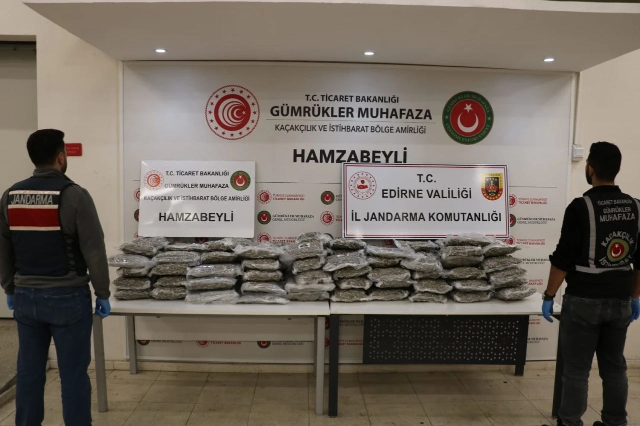 Hamzabeyli Gümrük Muhafaza Kaçakçılık ve İstihbarat Müdürlüğü ve Edirne İl Jandarma Komutanlığı ekiplerince Hamzabeyli Gümrük Kapısında ortak yapılan operasyonda 97 paket içerisinde 105,234 kilogram esrar ele geçirildi.